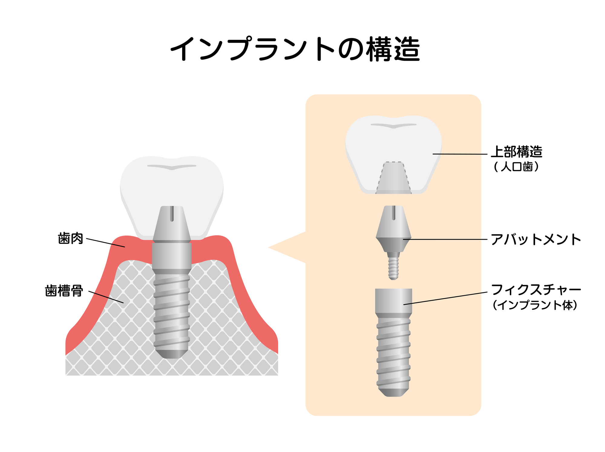 このインプラントは、機能ごとに3つのパーツに分かれており、それぞれが役割を分担しながら歯としての働きを支えています。